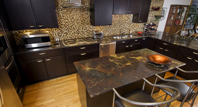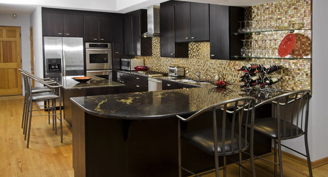 A Lakeview home converted a monotone cream colored kitchen & bath into this rich contemporary design. Granite countertops and iridescent glass mosaic backsplash complement each other beautifully and change their character throughout the day.