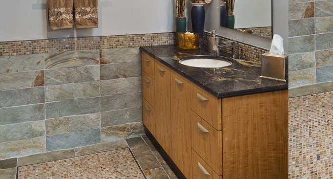 A full bath was converted into an elegant powder room to provide more space to the adjacent play room. The color scheme highlighted the earth tones in the granite to provide a stunning compliment to the kitchen. The design featured a unique slate tile with a tumbled mosaic stone inset surrounded by a hand forged bronze liner. This liner was also used to cap the wall tile. |
