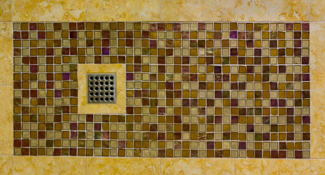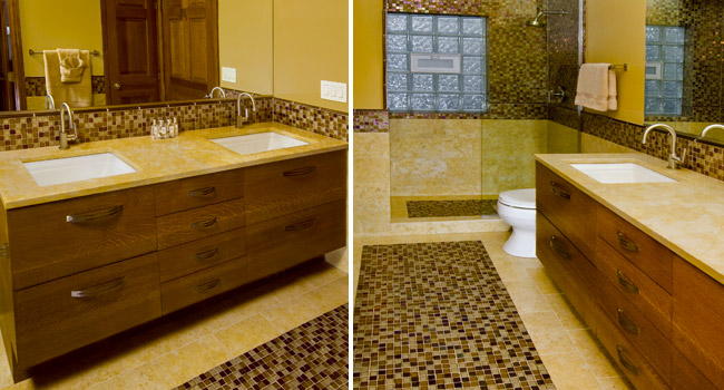 This master bath was transformed into a spa-like bath with contemporary finishes. The traditional tub/shower was replaced with a large shower and a bench using a mixture of iridescent glass and Roman Gold stone tile The vanity was custom designed and includes two large sinks. A thick limestone top was selected for the counter.